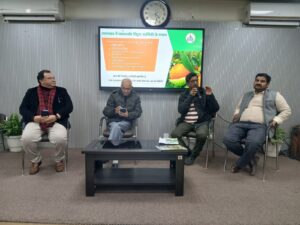 हरेला गाँव धाद की पहल पर आयोजित विमर्श मे आगाज फेडरेशन के जगदम्बा मैठानी,क़ृषि उत्पादन मंडी समिति के सचिव अजय डबराल, गढ़वाल विश्वविद्यालय के प्रोफ़ेसर डॉ तेजपाल बिष्ट ने अपना पक्ष रखा.